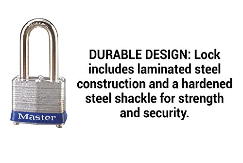 DURABLE DESIGN: Lock includes laminated steel construction and a hardened steel shackle for strength and security.