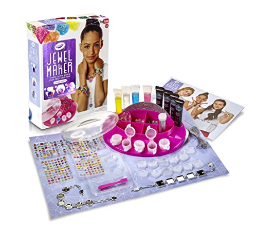 Includes work station with storage, 4 bottles solution a, 4 bottles solution b, 1 tube glitter , 1 sheet confetti, 5 mixing pots, 2 silver link bracelets,