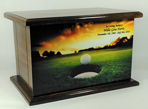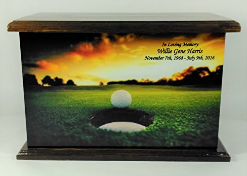 Product Description Beautiful solid wood urn. A sublimated plaque with golf ball and golf course scenery sublimated plate Please specify engraving details through email. *Secure bottom opening * Outside dimensions: 6.25"x 10" x 5.5" * 260 cubic inch capacity FULL SIZE ADULT URN Personalized engraving included. Please use the option to customize the product before adding it cart 0