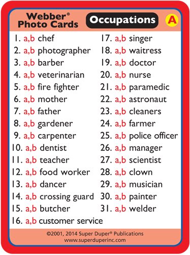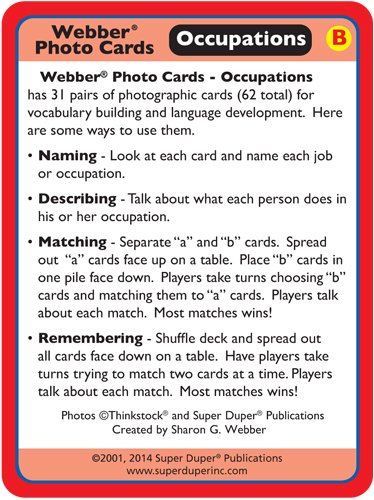 We revised our popular and best-selling Webber Photo Occupations cards with 31 pairs of beautiful, NEW color photographs! These card pairs are ideal for language or writing activities and for playing Memory, Match-up, Go Fish, and other games. Webber Photo Occupations