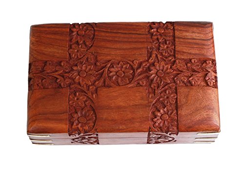 Internally lined with rich red velvet, features intricately hand carved geometric floral patterns with brass angles at corners.