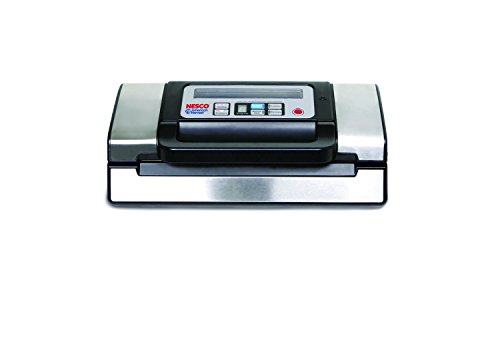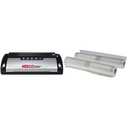 Save time and money with the Nesco VS-02 Food Vacuum Sealer! Prepare whole meals in advance, save leftovers, and reseal foods such as potato chips and cereal in their original package. Eliminate freezer burn, reduce spoilage and waste. Fully automatic, one-touch operation and automatic shut off makes it so easy to use. The unit has a powerful piston pump with a seal only switch to prevent over vacuuming and crushing of delicate foods. Features switch to extend sealing time for wet items or tighter sealing. This vacuum sealer can also be used to protect special papers and documents, or to keep supplies dry during camping or traveling. A roller storage compartment includes bag cutter for added convenience. Unit comes with 2 rolls of 8.66" X 9.8' bag material, 5 pieces of 8.66" X 11.8" bags and 5 pieces of 11.0" X 11.8" bags. We recommend Nesco brand Vacuum Sealing Bags model VS-03R, VS-05B, VS-06B, VS-04R, VS-07V. Bagging material is extra strong, with crossed air venting ribs on both sides of bags for maximum air extraction. 110-watts. Black and silver.Feature