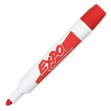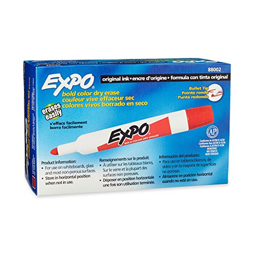 Bright, vivid, non-toxic ink is easy to see from a distance. Erases cleanly and easily with a dry cloth or Expo eraser. Quick-drying, smear-proof ink erases easily for no ghosting. Durable bullet tip allows for broad, thick lines. AP certified non-toxic. Made in the USA Expo Original Dry Erase Markers, Bullet Tip, 12-Pack, Red.Feature