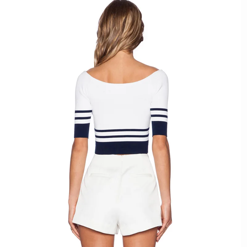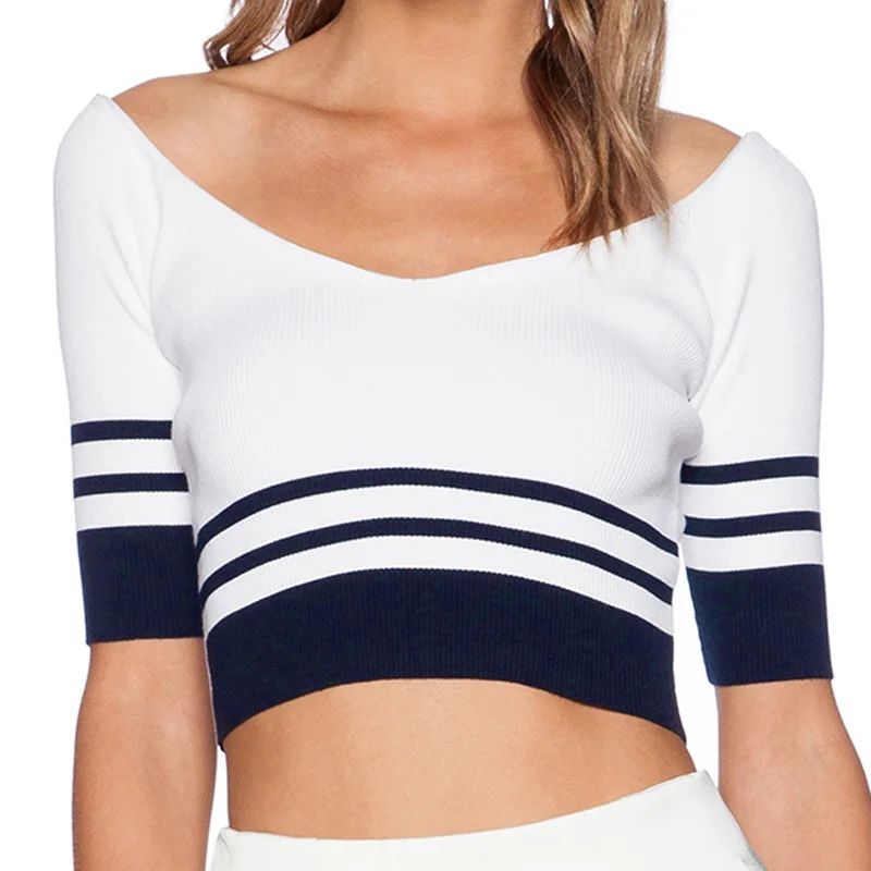 HDY Haoduoyi White Stripe Sexy Crop Tops Cold Shoulder Half Sleeve Knitted Sweatshirt Autumn Brief Female Pullover Sweatshirt | |||||||||||||||||||||||||||||||||||||||