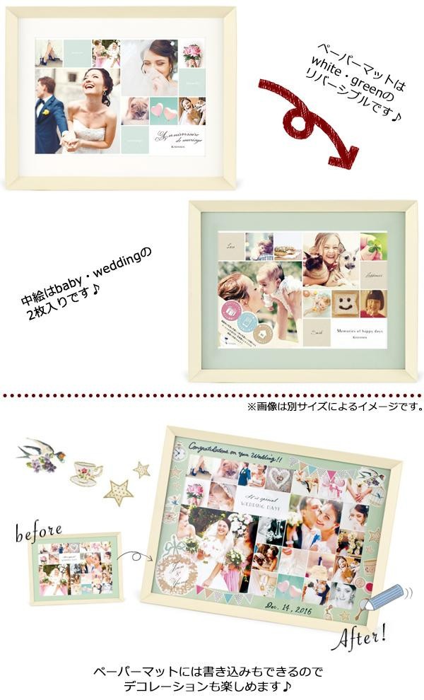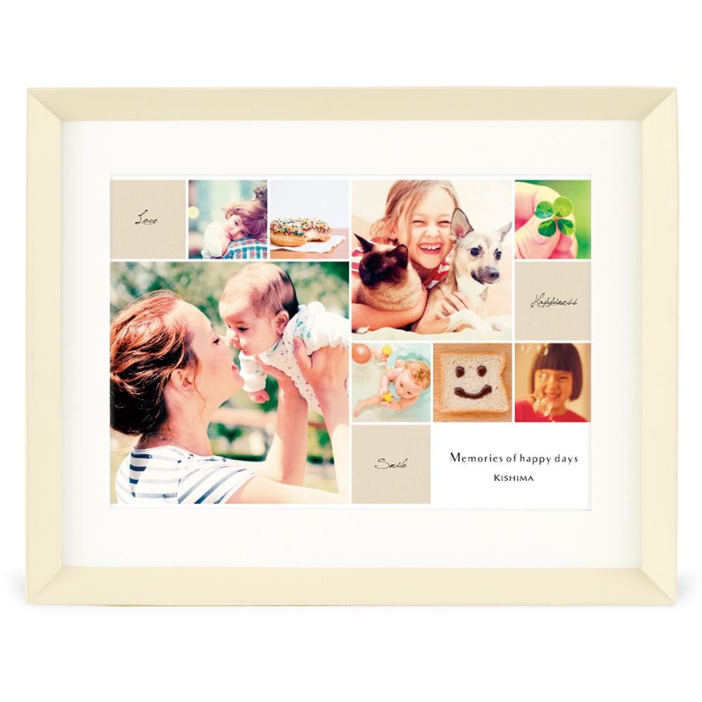 | スマートフォンなどの写真を、アプリや写真屋さんで手軽にランダムに配置して印刷できるサービスに最適なフォトフレーム。細かな写真をたくさん並べても邪魔せずそっと引き立ててくれるスッキリとしたデザインが魅力です。天然木を使用した上質な雰囲気に加え、リバーシブルのペーパーマットには書き込みもできるので、寄せ書きやデコレーションを施して贈り物にするのもオススメです。 |