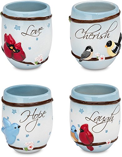 -. Binding : Kitchen -. Brand : Peace, Love and Birds by Pavilion -. Color : Multicolored -. EAN : 0664843520103 -. Feature : Four separate designs, laugh, hope, love, cherish / Excellent quality ceramic construction / Handwash recommended / Beautifully detailed set of 4 teacups / Comes gift boxed, makes a great gift to yourself or someone special -. Label : Pavilion Gift company -. Manufacturer : Pavilion Gift company -. Model : 52010 -. MPN : 52010 -. PackageQuantity : 1 -. PartNumber : 52010 -. ProductGroup : Kitchen -. ProductTypeName : KITCHEN -. Publisher : Pavilion Gift company -. Size : 3" -. Studio : Pavilion Gift company -. Title : Peace, Love and Birds by Pavilion Laugh Hope Love Cherish Teacups, 3-Inch, Set of 4 -. UPC : 664843520103