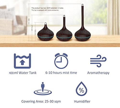 Large Capacity and Mist Output: This diffuser can hold up to 400ml of water and produce up to 30ml of moisture per hour. It can provide continuous use of up to 6-8 hours each time and covers up to 20-30 square meters, Automatic power off when water runs out, which ensures safety