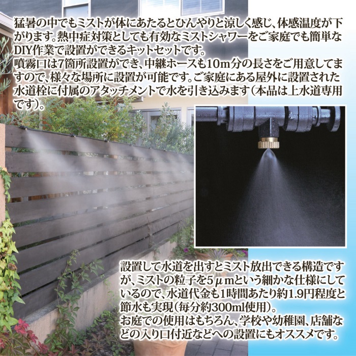 ●熱中症対策としても有効なミストシャワーをご家庭でも簡単なDIY作業で設置ができるキットセットです。