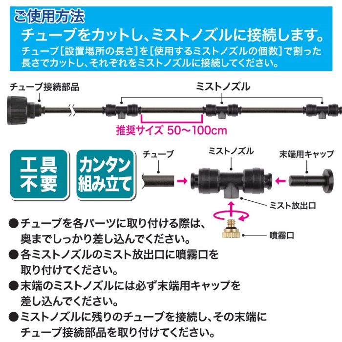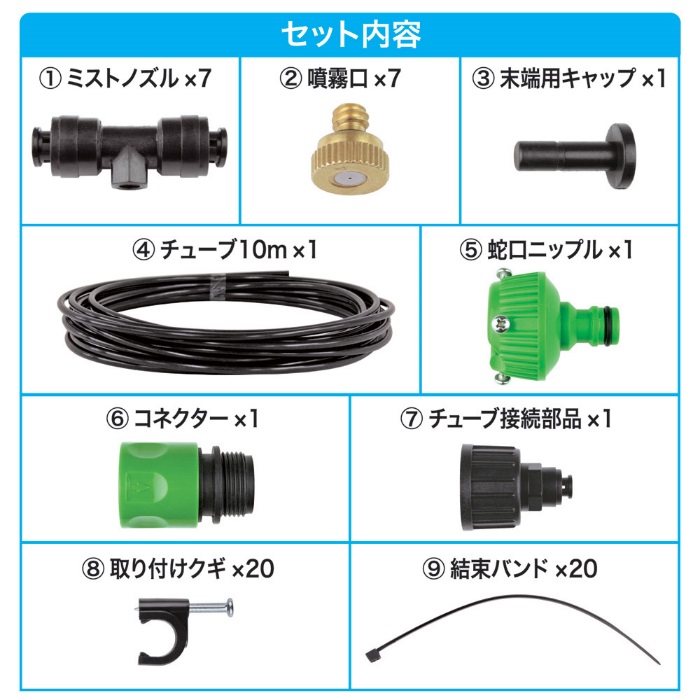 ●セット内容:ミストノズル×7、噴霧口×7、末端用キャップ×1、チューブ(10m)×1、蛇口ニップル×1、コネクター×1、チューブ接続部品×1、取り付けクギ×20、結束バンド×20