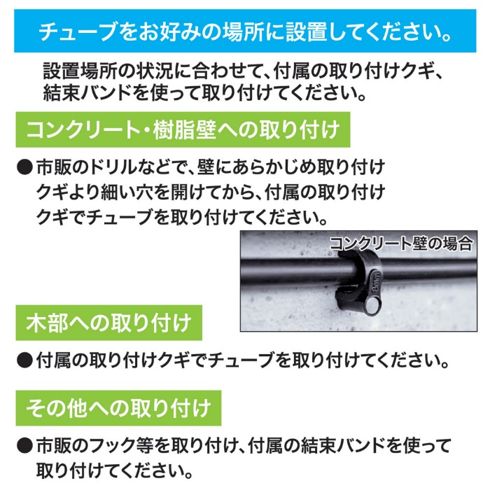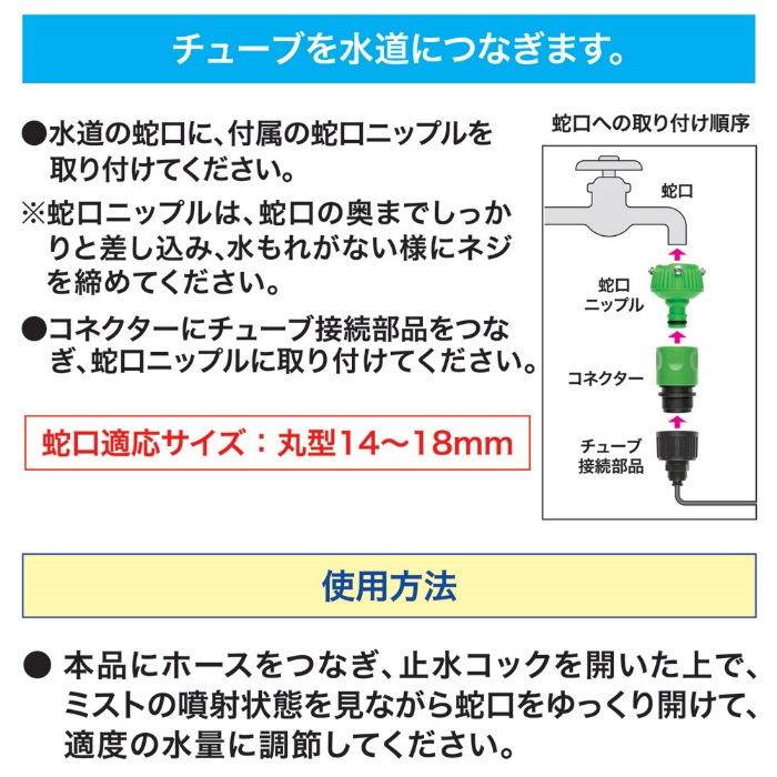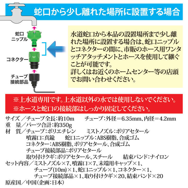 ●材質:チューブ/ポリエチレンミスト、ノズル/ポリアセタール、噴霧口/真鍮、蛇口ニップル/ABS樹脂・合成ゴム、コネクター/ABS樹脂・ポリアセタール・合成ゴムチューブ、接続部品/ポリアセタール、取り付けクギ/ポリアセタール・スチール、結束バンド/ナイロン