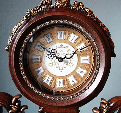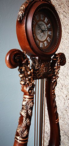 Studio : Atlantic Collectibles Publisher : Atlantic Collectibles Binding : Kitchen Product Description This grandfather clock boasts of excellent curvaceous design with vintage golden carving finishes throughout the body and the top. The barrel shaped base is meticulously designed with floral blossoms and motifs all around. The clock is inspired by the musical instrument harp so you will see beautiful curves with string looking lines in the middle. It is made of polyresin, hand painted and polished in mahogany wood color finish. Clock is battery operated. 0