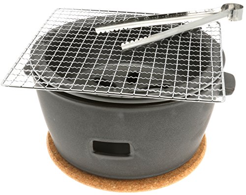 Yakitori are bite-size chicken pieces skewered and cooked over charcoal. At its most basic, popular cuts of chicken such as breast and thigh are used. In Japan, the list of different skewers available is long and includes skin, meatballs, wings, tail, cartilage, heart, liver, and gizzard. Salt is used as a basic seasoning, and a finishing brush of tare, a glaze resembling teriyaki sauce, is also common. Yakitori is popular at casual outdoor get together where friends gather around the grill to cook a few skewers at a time while socializing. This yakitori grill is perfect for a gathering or party. The grill consists of two pieces. The main outer piece of the grill has vents to facilitate airflow. A secondary insert sits inside the outer piece of the grill, and has petal-shaped cutouts on the bottom. The petal shaped cutouts serve two purposes: one is to allow air to flow underneath the charcoal to keep it aflame, and the other is to allow ash to fall through as the charcoal is spent. This ensures very hot and even heating, a key to tasty yakitori. The set includes a wire grill grate, a cork trivet to protect the surface upon which the grill is placed, and a pair of tongs.