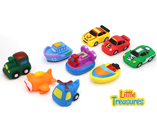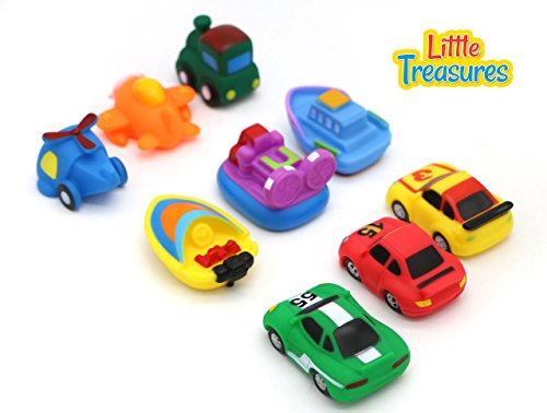 - WIDE-RANGING: Total of 9 squirting squeaking vehicles includes 3 race cars, train, helicopter, airplane, hovercraft, tugboat, motorboat and submarine for transporting fun into bath time