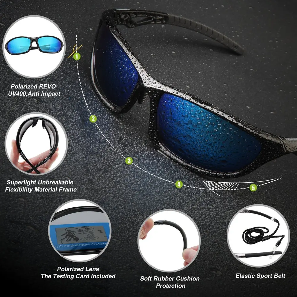Model Number: TR010 feature: REVO POLARIZED LENS- 100% UV400 protection coating, blocks 100% harmfu