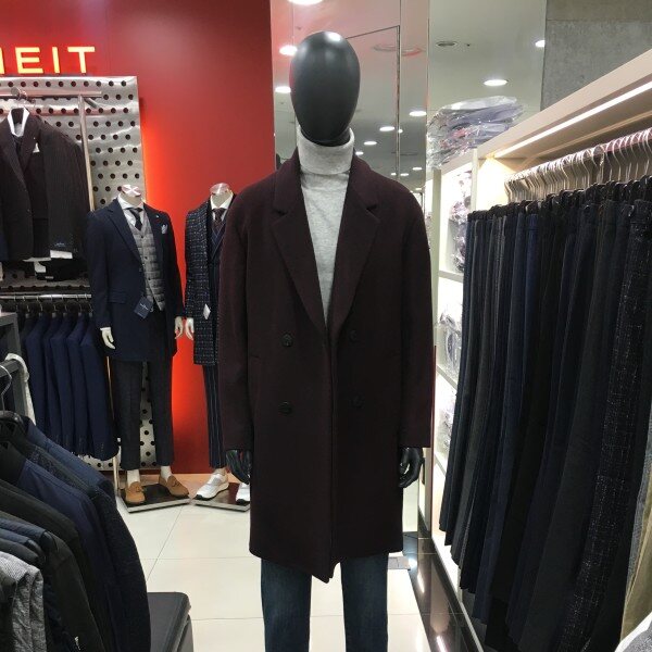 버건디컬러의 어깨가 자연스럽게 드랍되는 세미오버핏 더블코트입니다.