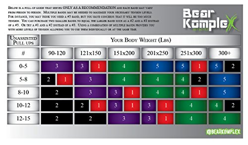 - Feature : THIS LISTING IS FOR A SINGLE BAND ONLY. YOU ARE CURRENTLY LOOKING AT THE #5 BLUE RESISTANCE BAND. This band will give you 60 to 150 lbs of resistance for your exercises. Here are the details of the BK bands we offer: Band #1 RED - provides 10-35lbs of resistance (1/2"), Band #2 BLACK provides 30-60lbs of Resistance (7/8"), Band #3 PURPLE provides 40-80lbs of resistance (1-1/4"), Band #4 GREEN provides 50-120lbs of resistance (1-3/4"), Band #5 BLUE provides 60-150lbs of resistance (2-1/2") / RESISTANCE LABELED ON EVERY BAND. Know EXACTLY how much resistance or support the Bear KompleX bands are providing you in your pullup or muscle up progressions. This makes it easy to document and continue with your fitness goals. / MAKE BIG GAINS! Bear KompleX bands are perfect to train with on your Pull-Ups, Muscle-Ups and Dips. Use one band or combine two for quick gains. / COMBINATION BANDS FOR FAST PROGRESS! Use multiple bands for multiple levels of resistance. Depending on your strength and body weight, use combo of 1 or 2 bands for up to 3 resistance levels. Start with one band and as you fatigue, add another to keep going. / 100% SATISFACTION GUARANTEE! We are here to help you GET BETTER! If at any point you need assistance or support we are to help.