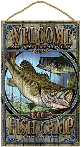 (SJT96309) Fish Camp (Bass) Welcome 10" x 16" Rustic Wood Plaque Sign featuring the artwork of Michael Messina