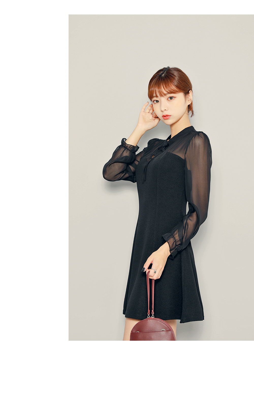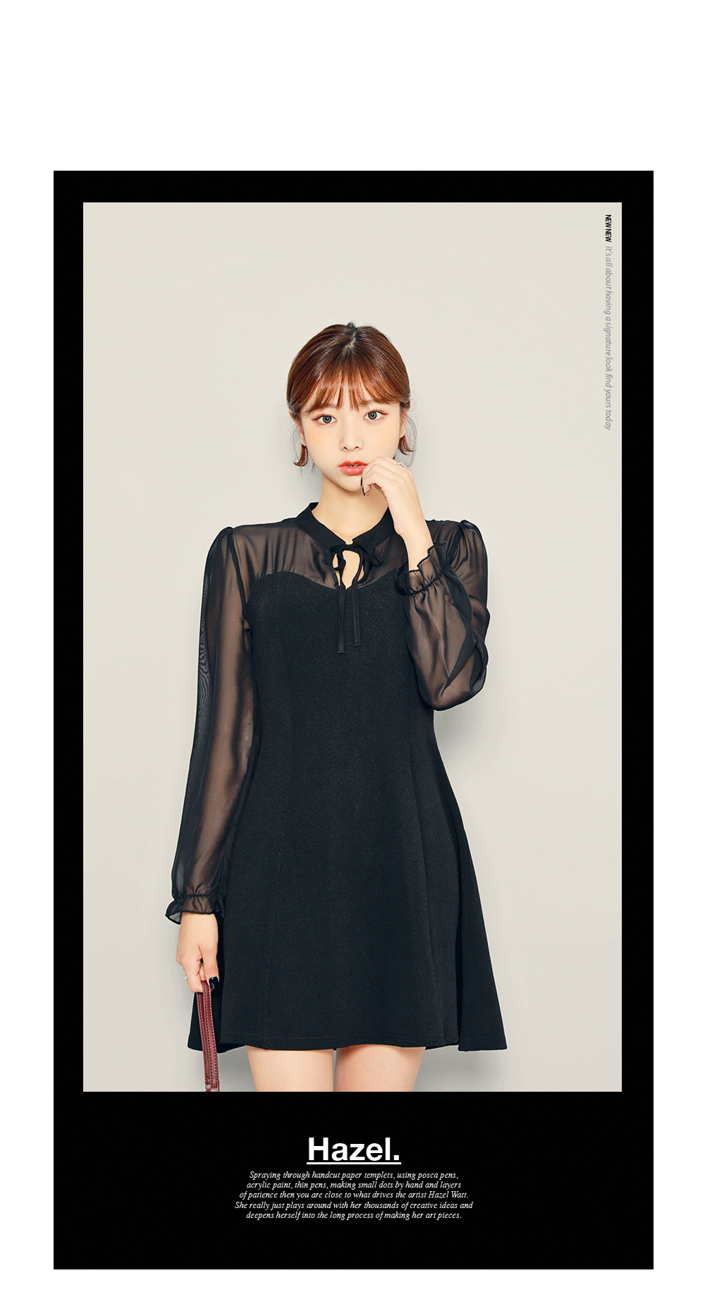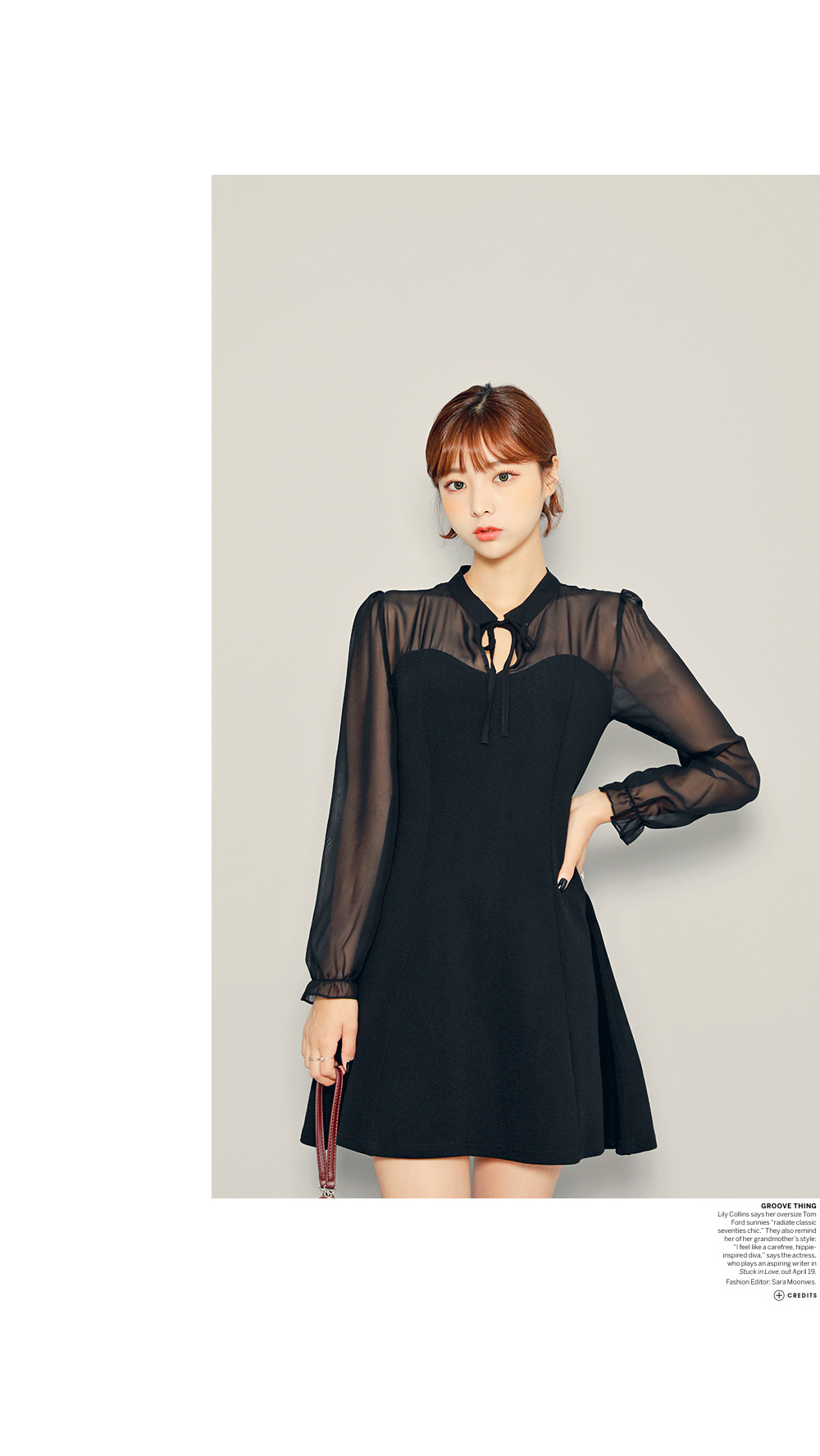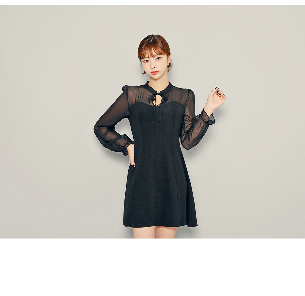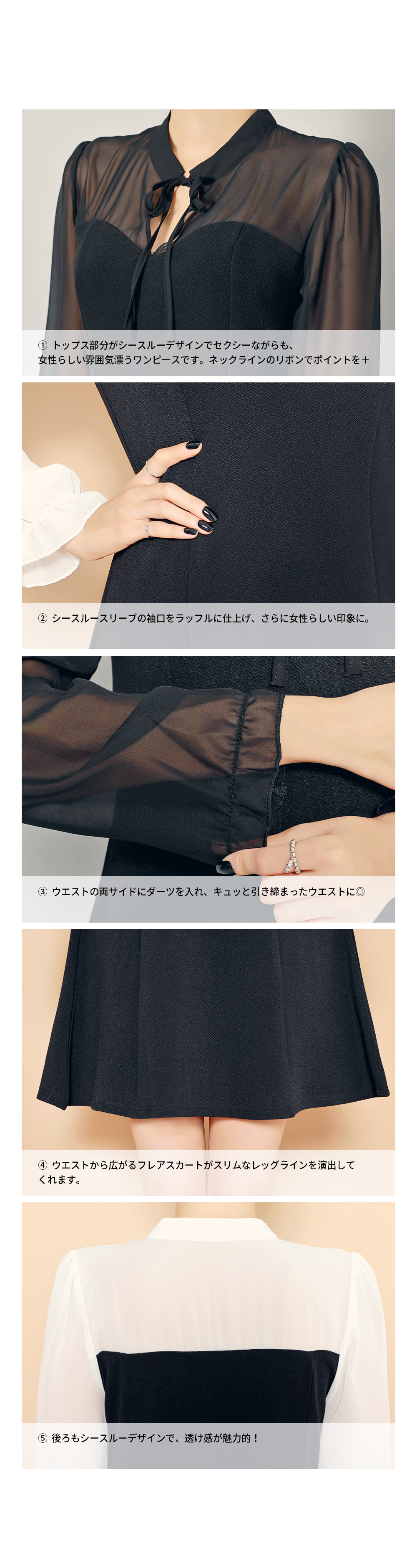 首元から袖までのシースルーデザインが魅力的な一枚です。ウエストから広がるスカートラインで、くびれ効果も◎首元のリボンと、袖口のラッフルディテールで、女性らしい印象に。ラブリーさと、セクシーさを兼ね備えた、女性らしさをアピールできるアイテム♡特別な日にピッタリな高級感溢れる一枚です。