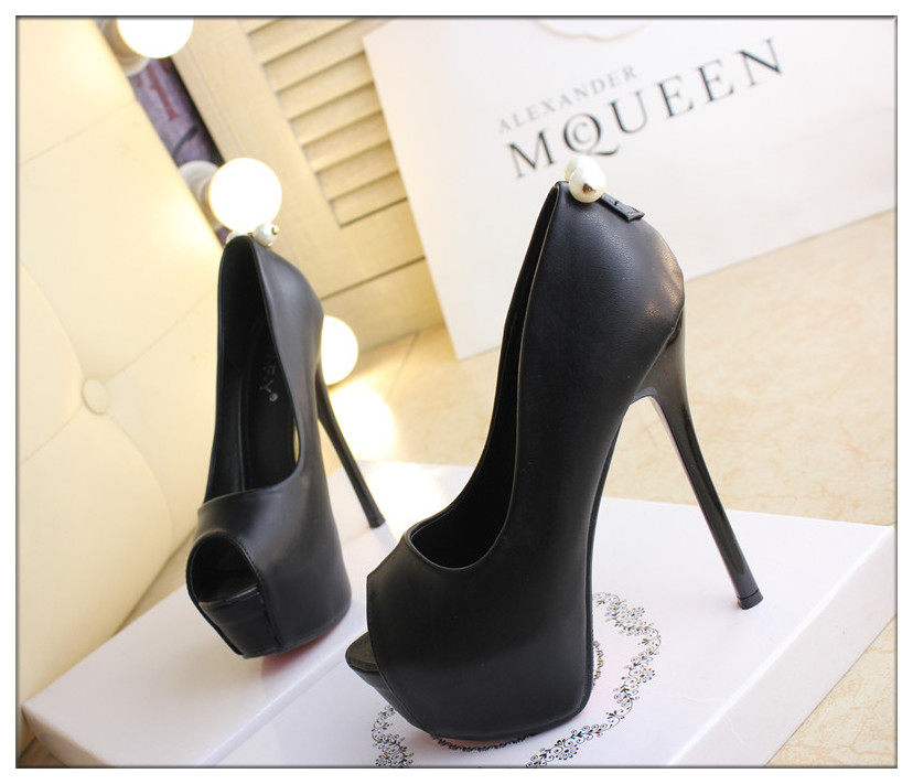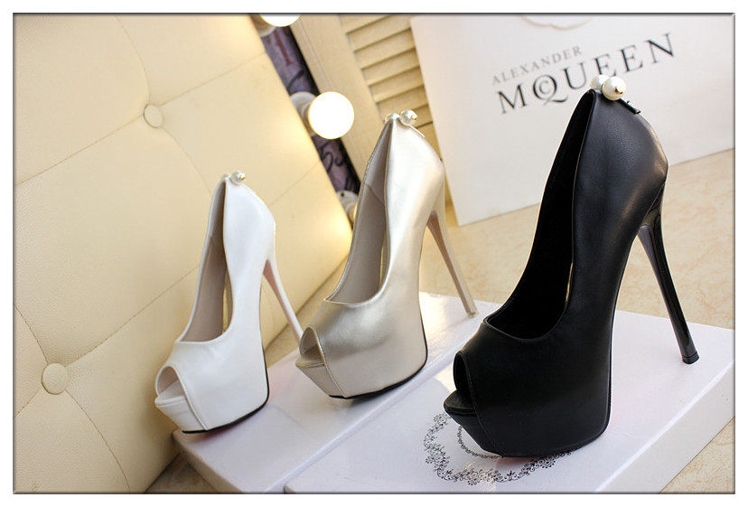 14cm细跟超高跟白色婚鞋金黑色夜店高跟单鞋防水台性感珍珠女秋款