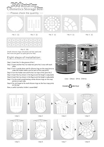 Large Storage Capacity and Space-saving: Measured 12.2 Inch (31 CM) in height and 9.45 Inch (24 CM) in base diameter when assembled, the cosmetic storage box can accommodate at least 30 makeup brushes, 20 skincare products (depending on the size of products) with multi compartments to hold combs, lotions, hair spray, perfumes, lipsticks, nail polish, eyeliner, foundations, creams, blushes, eye shadows, jewelry, and more, saving your counter space and keeping your countertop and vanity tidy.