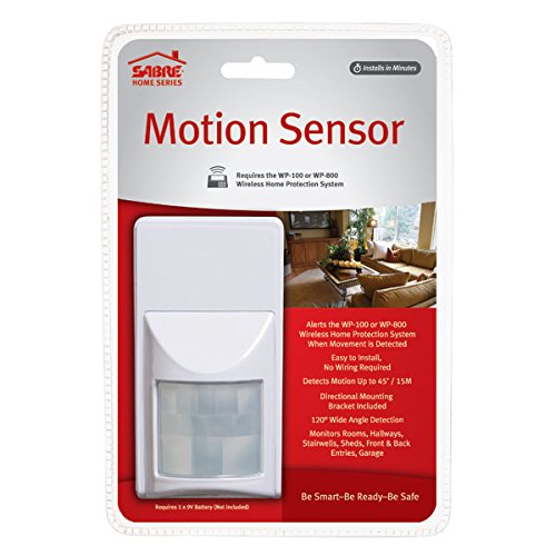 -. Feature : Alerts the WP-100, SABRE Wireless Home Protection System, When Movement is Detected / Ideal for a Wide Range of Areas Including Rooms, Hallways, Stairwells, Sheds, Garages, Front and Back Doors 120 Degree Wide Angel Detection / Installs in Minutes - Directional Mounting Bracket Included Requires 1x9V Battery / Best Looking: Consumer preferred, aesthetically pleasing alarms ideal for the home setting / Affordable: No setup, installation or monthly monitoring fees