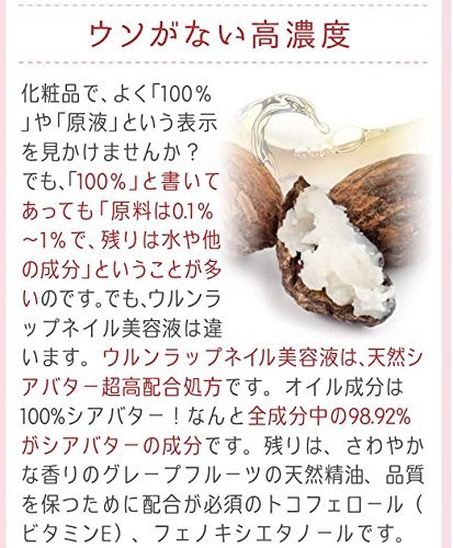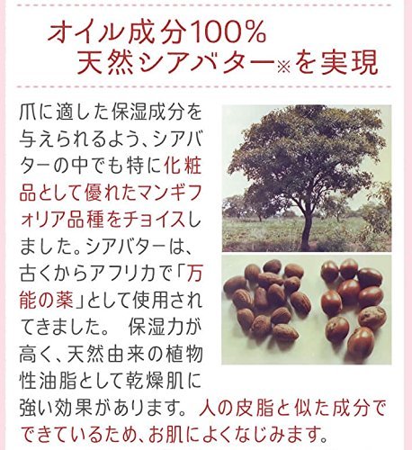 ネイルオイル成分が100%天然シアバターの本格派ネイル美容液です。爪は皮膚と同じで保湿がとても重要です。 無着色、無香料、無鉱物油、界面活性剤不使用、紫外線吸収剤不使用、ノンアルコール、パラベンフリー、旧指定成分無添加 (注:※ネイルオイル成分100%シアバター、全成分中98.92%がシアバター)