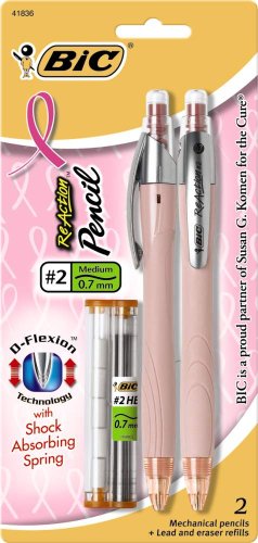 Reaction mechanical pencil in support of Susan G Komen for the Cure. The pencils are pink and come with extra lead and erasers. The lead is 0.7mm. The pencils have a shock-absorbing spring system, for extra comfort and control. There is also a comfortable full length grip.