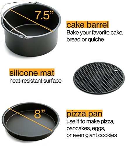 Cook more than ever before with the 6 Piece Cozyna Air Fryer Accessory Set! Air Fryer Accessory Set Includes: 1 x Cake Barrel 1 x Pizza Pan 1 x Metal Holder 1 x Multi-Purpose Rack with Skewers 1 x Silicone Mat 1 x Recipe book Cake Barrel: Bake your favorite cake, bread or quiche in the Cake Barrel! The even-wall construction allows for optimal heating, while the handle allows for convenience and easy maneuverability! Pizza Pan: Aside from experimenting with different pizza recipes, this Pizza Pan also provides the perfect surface for a variety of other treats! You can use it to make pancakes, eggs, potatoes, quesadillas or even giant cookies! With the air fryer accessories grill pan, the possibilities are limitless! Metal Holder Maximize your cooking surface with the Metal Holder. Simply prepare your food as desired and place one layer of food in the air fryer basket as usual. Next, place this Metal Holder on top and finally add your second layer of food on the metal grate. Now you will have complete meals ready in no time! Multi-Purpose Rack with Skewers The Multi-Purpose Rack not only maximizes your cooking space, but it also comes with 3 skewers. These skewers are perfect for vegetable and meat shish kabobs while the bottom layer is perfect for sides! Silicone Mat The Silicone Mat provides you with a heat-resistant surface to place your hot accessories on. Use an oven-safe mitt to remove your accessory from the air fryer and place it on the Silicone Mat. WARNING: Do not touch the accessories until they have completely cooled! 0 |