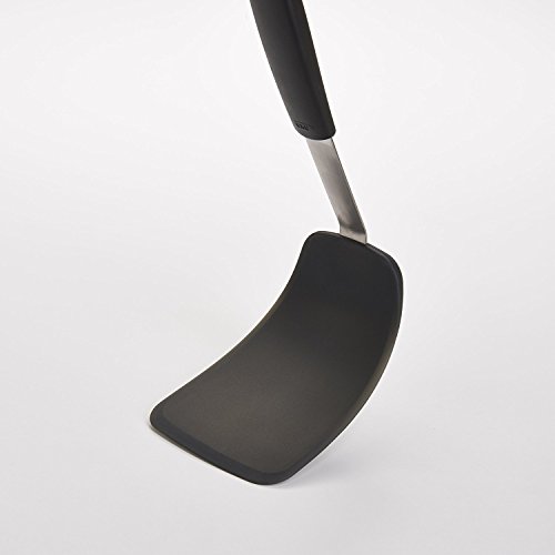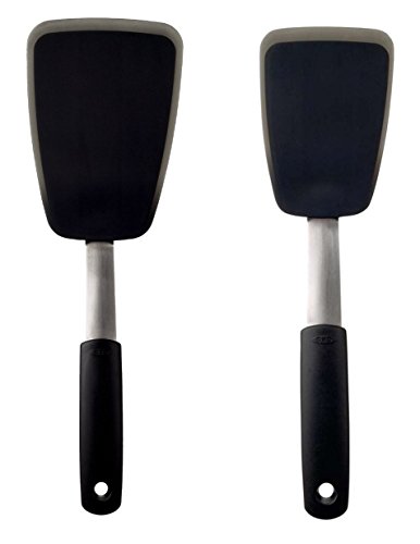 Product Description The OXO Good Grips Silicone Flexible Turners combine the strength of stainless steel with the advantages of silicone. The silicone outer layer, which is heat resistant to 600 degrees Fahrenheit and safe for non-stick cookware, is bonded to a flexible stainless steel core for added stability. The Turners have thin, flexible edges that glide easily beneath all foods and are perfect for flipping fragile foods while keeping them intact. Use the Silicone Flexible Turner to lift cookies from a cookie sheet without breaking them. All Silicone Flexible Turners have soft, comfortable, non-slip grips and are the perfect companions to non-stick cookware and bakeware. 0