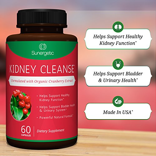 -. Binding : Health and Beauty -. Brand : Sunergetic -. EAN : 0641606857737 -. Feature : POWERFUL KIDNEY CLEANSE SUPPLEMENT: Your kidneys are vital organs that require key nutrients to operate optimally and stay healthy. Our potent natural Kidney Supplement helps flush toxins, supports kidney function and helps improve urine flow. If you strle with irritation or urinary leaks, that may be a symptom of poor bladder control. Give your kidneys the support they need with our superior kidney formula. / ADVANCED BLADDER & URINARY TRACT SUPPORT: Your kidneys are hard working organs. Good urinary tract health can improve bladder control, fight infection and support kidney function. We combine nature's most effective herbs to provide strong kidney, bladder and urinary health giving your kidneys the support it needs. Our kidney health formula with Organic Cranberry Extract, Astragalus root, Uva Ursi herb and Stinging Nettle helps rejuvenate your kidneys and helps soothe urinary tract. / OVER 20 HERBS INCLUDING ORGANIC CRANBERRY EXTRACT: Our unique kidney support formula provides your kidneys with an impressive array of herbs and antioxidants including Organic Cranberry Extract, Java Tea, Uva Ursi Leaf, Astragalus, Juniper Berry, Nettle Leaf, Birch Leaf, Gravel Root, Horesetail Powder, Buchu Leaf, Goldenrod, Red Rasberry Fruit, Ginger Root, Rosemary Leaf and MORE! / MADE IN THE USA: Our Kidney Cleanse Supplement is manufactured in the USA in an FDA registered facility that adheres to Good Manufacturing Practices (GMP). We are committed to maintaining the highest quality supplements on the market. / SATISFACTION GUARANTEED: We are so sure that you will love our natural Kidney Support supplement that we protect you with an unconditional money back guarantee at anytime. We believe 100% in our kidney health supplement which is why we can offer such a strong guarantee on all our natural supplements. -. IsAdultProduct : 0 -. Label : Sunergetic -. LegalDisclaimer : These statements have not been evaluated by the Food and Drug Administration (FDA). This product is not intended to diagnose, cure, treat or prevent any disease. -. Manufacturer : Sunergetic -. PackageQuantity : 1 -. ProductGroup : Health and Beauty -. ProductTypeName : HEALTH_PERSONAL_CARE -. Publisher : Sunergetic -. Studio : Sunergetic -. Title : Best Kidney Cleanse Supplement - Premium Kidney Support Formula With Organic Cranberry Extract Helps Support Healthy Kidneys, Detox, Bladder Health & Urinary Tract- 60 Vegetarian Capsules -. UPC : 641606857737