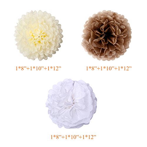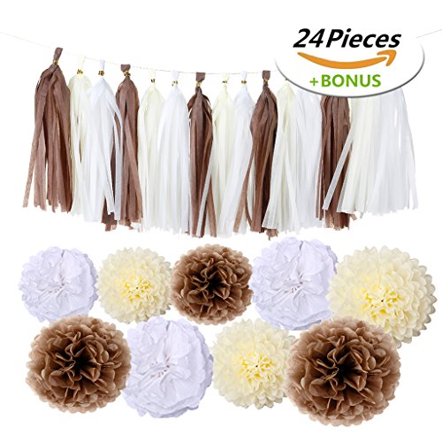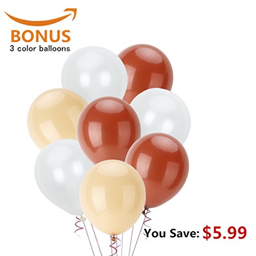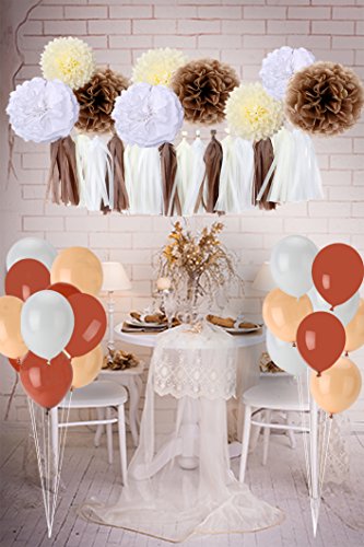 Product description The tan kit is perfect for fall harvest party decorations and any other celebrations with enough varieties. Each pom pom was individually wrapped and comes with instructions. The tissue paper tassel also has instruction and we have tutorial picture in our page. You can hang on tables, walls, in doorways or across aisles. Maybe it takes time to get these to look beautiful. Hope you enjoy it and make your party perfect! Wish you have a happy party! ? Product details Tissue paper pom poms: Size: 3*8inch 3*10inch 3*12inch Color: tan,ivory,white Quantity: 9pcs ? Tissue paper tassels: Size: 9.8inch*13.8inch Color: tan,ivory,white Quantity: 15pcs ? Balloons: Size: Approx 10inch(2.2g) Color: tan, light brown,white Quantity: 30pcs Warning:? Children under 8 years can choke or suffocate on uninflated or broken balloons. Adult supervision required. Keep uninflated balloon from children. Discard broken balloon at once. Keep balloons at a safe distance from the eyes. 0