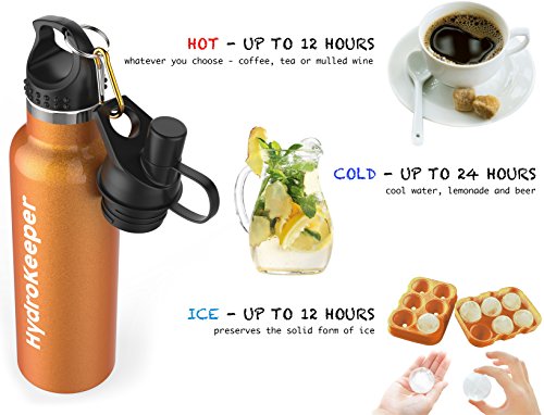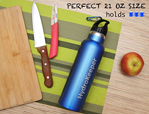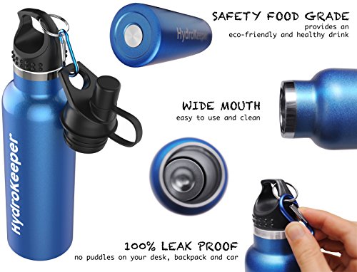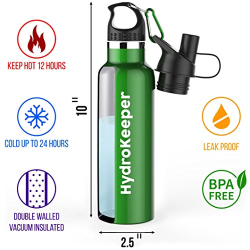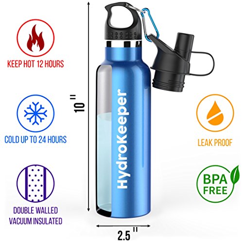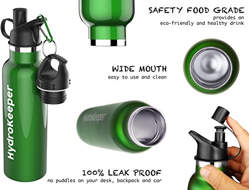 -. Feature : WATER BOTTLE WITH FREE SPORT CAP: A set of both - straw and loop leak-proof caps is included for your convenience, whether you choose hot, cold or room temperature liquids. Loop cap can be used while camping or for any other reasons. Sport - is ideal for gym, fitness or cycling. A cute color carabineer is also included as a gift. / BPA-FREE GUARANTEED BY US SAFETY GUIDELINES. The HydroKeeper has been tested by a third party lab and met all US Safety Guidelines. It's an insulated water bottle that is made from BPA-free material - long lasting and free from any kinds of toxins, metallic taste and chemical leaking. It provides an eco-friendly and healthy way to stay hydrated while being in- or outdoors. / DOUBLE WALLED INSULATED WATER BOTTLE. 100% LEAK-PROOF The Hydrokeeper water bottle is made from food grade 18/8 stainless steel. It is highly durable and has a sleek and convenient design. It is double-walled vacuum insulated and sweat-free. 100% leak-proof water bottle - no any puddles on your desk or in your car or any other places. / WIDE MOUTH STAINLESS STEEL WATER BOTTLE The HydroKeeper has a wide mouth. It is super easy to use and clean. / PERFECT SUITABLE SIZE The HydroKeeper has the most convenient and suitable 21-oz size. The bottle easily fits in a women's handbag or a children's backpack. The size is ideal to fit most car cup holders. Our travel bottle - is perfect for workouts and outdoor activity.