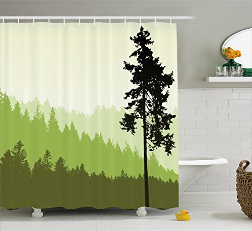 Apartment Decor Shower Curtain by Ambesonne, Nature Theme Pine Tree Silhouette on an Abstract Background, Fabric Bathroom Decor Set with Hooks, 70 Inches, Lime Green and Army Green