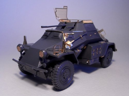 定番人気にして、近年では金属砲身を 同梱したり、他のセットを同梱した 戦線モノにしたりと現役バリバリの タミヤのsd.kfz222を更にグレード アップする好セット。 考証的にタミヤのものはPanzer Tracts誌の最新研究では細分される 型式の中でB型の5 Serieに非常に 近いものとなっています。 今回、これに基づき車体ほぼ全てを ディティールアップ、特に天蓋 メッシュは、キットと現在の寸法を うまく折衝した形で開閉選択可能、 更にハニカム形状の機関室メッシュは 再び紙創りさんにご協力を頂き、 Feeling Part製品も同梱。 一部クラッペの尖頭ボルトには金属 挽き物も同梱! 斧のみに使用されているクランプも 何とか間に合ったJenny's Clamp 方式を採用!Feature