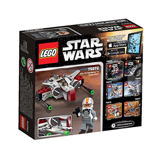 -. Binding : Toy -. Brand : L.E.G.O -. EAN : 5702015357845 -. Feature : Defend the Republic above Coruscant with the advanced L.E.G.O Star Wars 75072 ARC-170 Starfighter microfighter. / This great mini-scale version of the Republic's red starfighter features an amazing amount of detail, including folding wings, 2 flick missiles and a mini cockpit for the clone pilot to sit in! / Fire up the engines and get ready to track down the Separatists! / Includes a clone pilot mini-figure with a blaster p.i.s.t.o.l. / Ages 6 - 12. -. IsAdultProduct : 0 -. IsAutographed : 0 -. IsMemorabilia : 0 -. Label : L.E.G.O -. Manufacturer : L.E.G.O -. Model : 13280 -. MPN : 13280 -. PackageQuantity : 1 -. PartNumber : 13280 -. ProductGroup : Toy -. ProductTypeName : TOYS_AND_GAMES -. Publisher : L.E.G.O -. Studio : L.E.G.O -. Title : L.E.G.O Star Wars 75072 ARC-170 Starfighter -. UPC : 679113821699