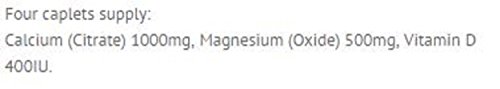-. Feature : Calcium Citate - the easy to absorb calcium / 1000 Mg of Calcium per Daily Dose / Contains 500 mgs Magnesium and 400 IUs Vitamin D per Daily Dose / No Sugar or Salt / Free Of Yeast
