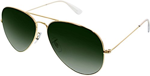 Unisex aviator style metal frame in shiny gold. Large version of the classic aviator. Classic green glass lens with option to RX.