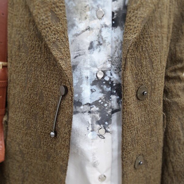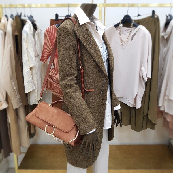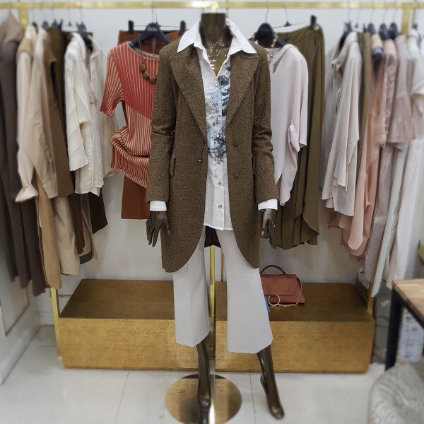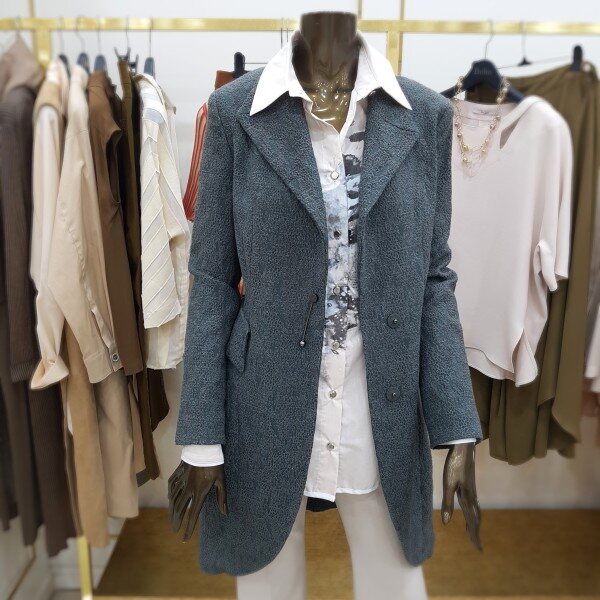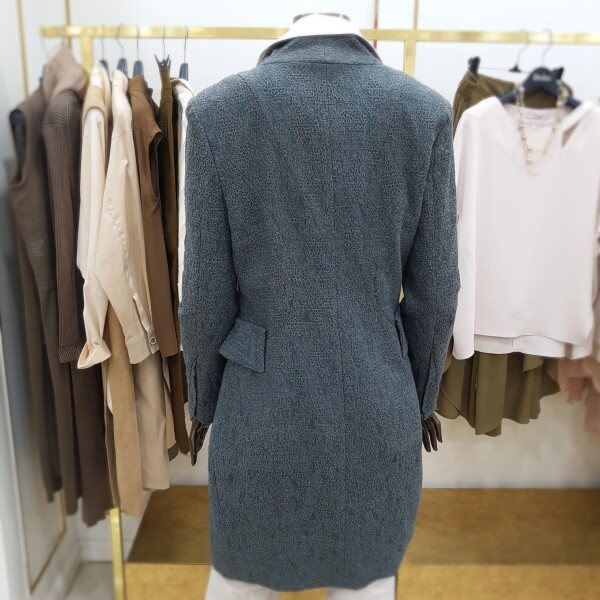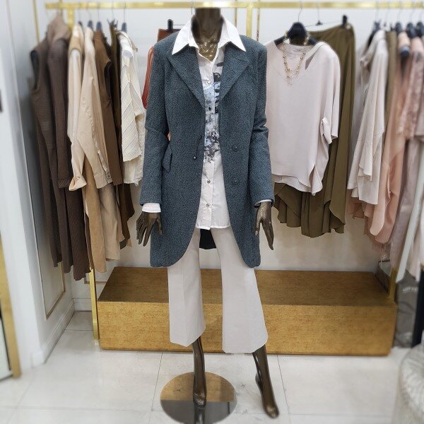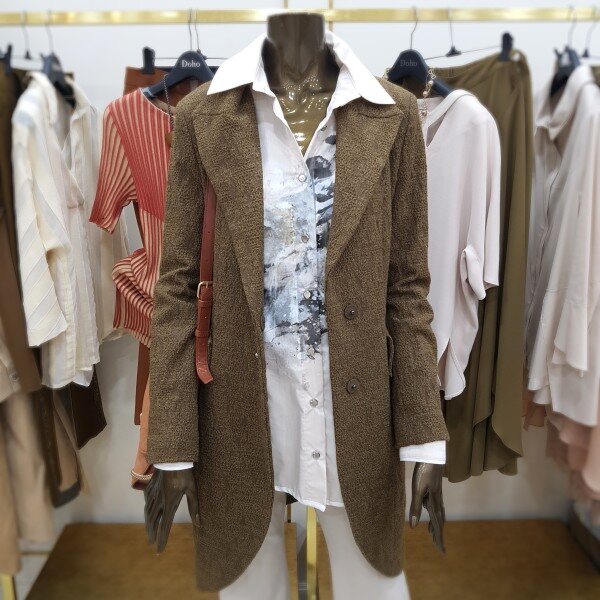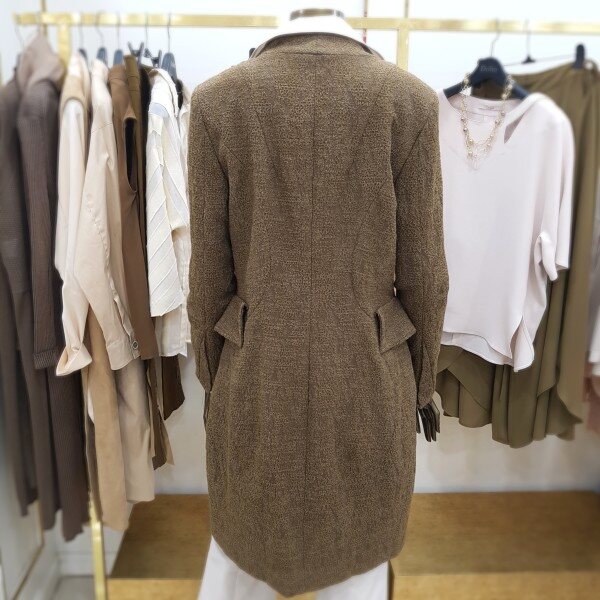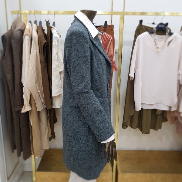 독특한 브로치 장식의 단추커버와 소재감이 특징인 자켓 입니다(도호상품의 멋을 보여주는 자켓입니다)