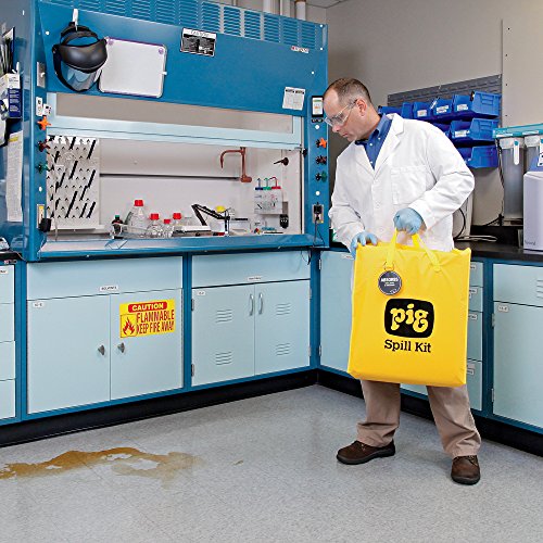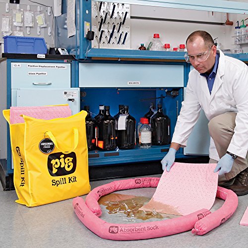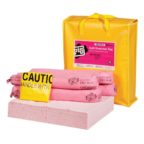 -. Feature : Durable, water-resistant bag with hook-and-loop closure keeps contents clean and dry / Pig hazmat socks stop spreading spills; Pig hazmat pads absorb quickly / Pig hazmat absorbents are specially treated for unsurpassed performance with concentrated corrosives, such as 98 percent sulfuric acid and 30 percent sodium hydroxide / Temporary disposal bags help make cleanup easier / Bright yellow bag and large, color-coded label make the kit easy to locate