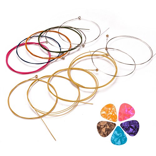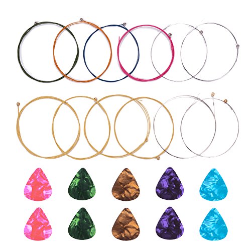 Features: String material: The strings are made of steel, with rustproof coating for durable use Application: Colored guitar strings are helpful for the guitar beginners to remember and practice and fits for guitarist to make their acoustic guitar look beautiful and awesome; The guitar picks are accessory for your electric, acoustic, or bass guitar Specifications: Each string length: approx. 90 cm/ 35.4 inch guitar pick diameter: 0.46 mm String color: yellow (colors have yellow and silver) and multicolor (colors have blue, green, rose red, brass and silver) Guitar picks color: random colors Package includes: 2 Set of 6 acoustic guitar strings (yellow and multicolor) 10 x Guitar picks (random colors) 0