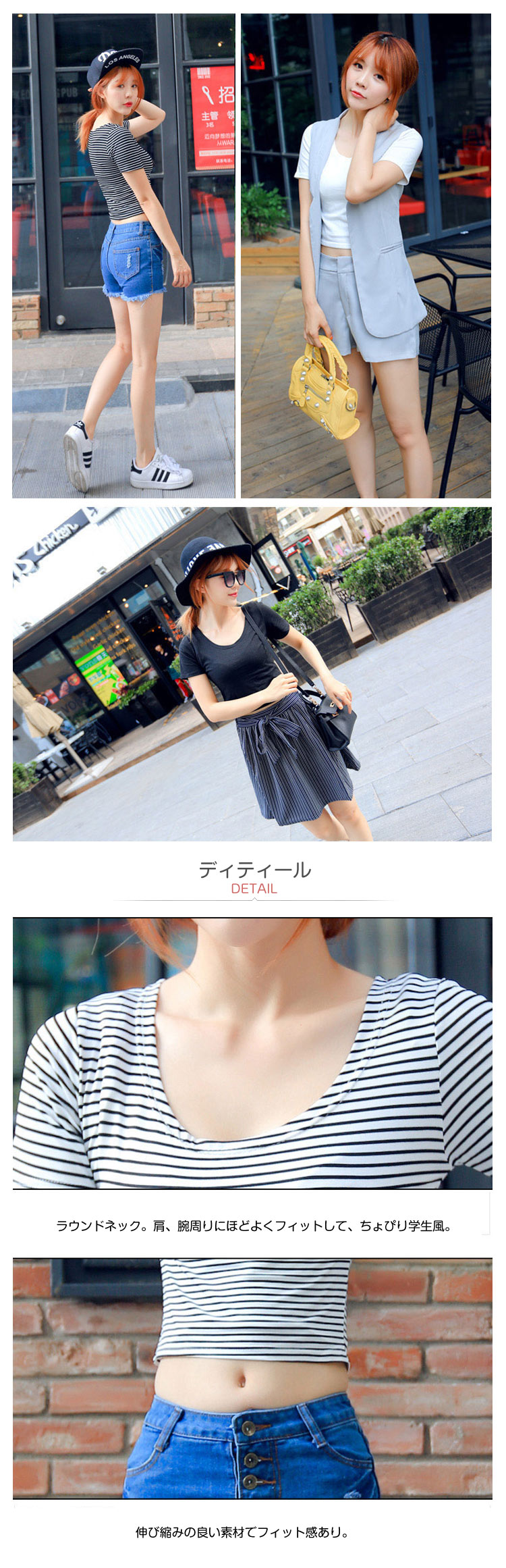 | 短め丈でおなか回りがスッキリ。伸び縮みして、体に良くフィットするタイプなので、重ね着もバリエーション豊か。スカートと合わせると清楚な学生風に。ボトムに合わせて元気にこの夏を過ごすのもオススメです。 | |
