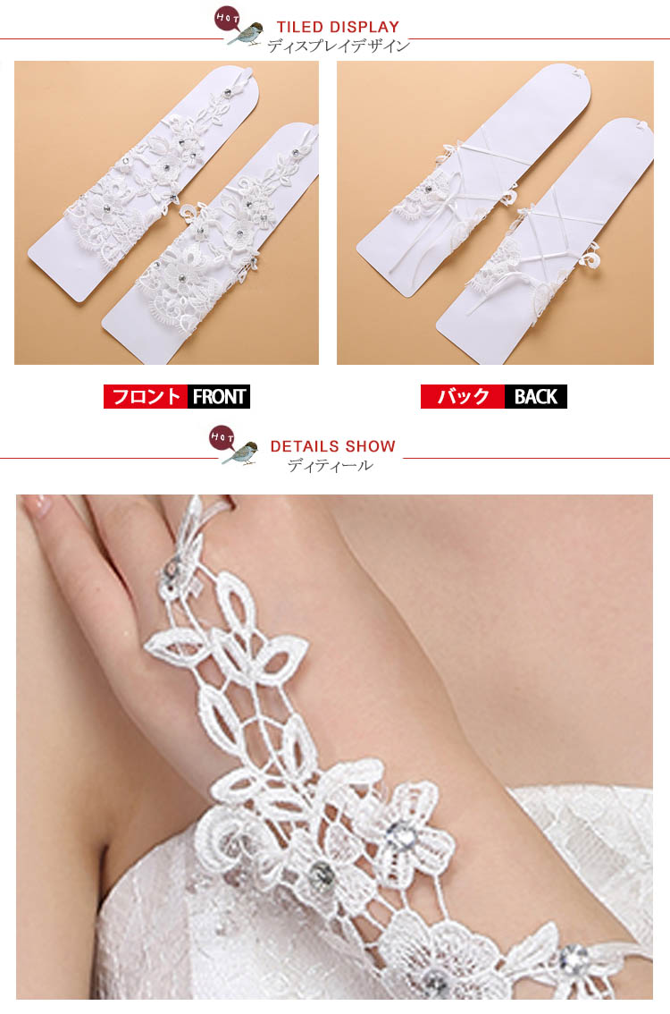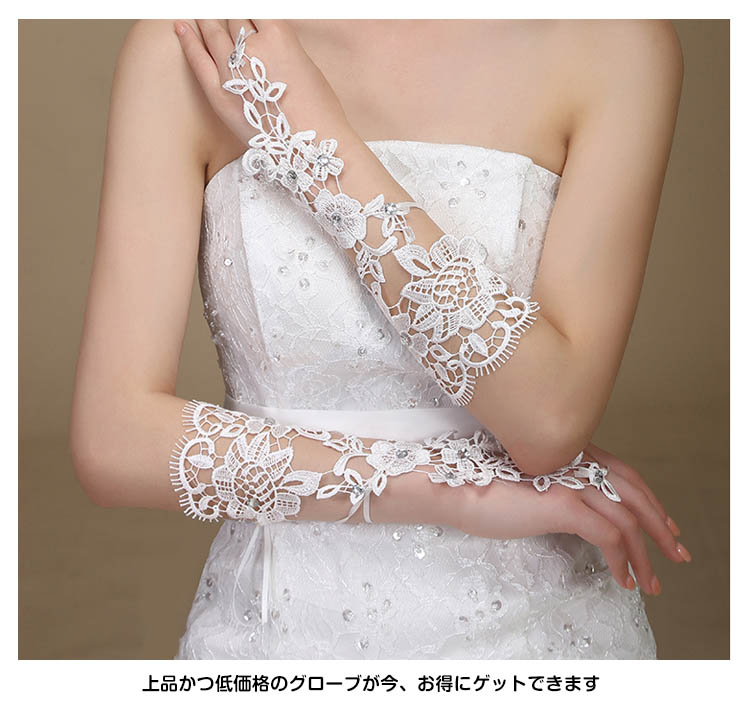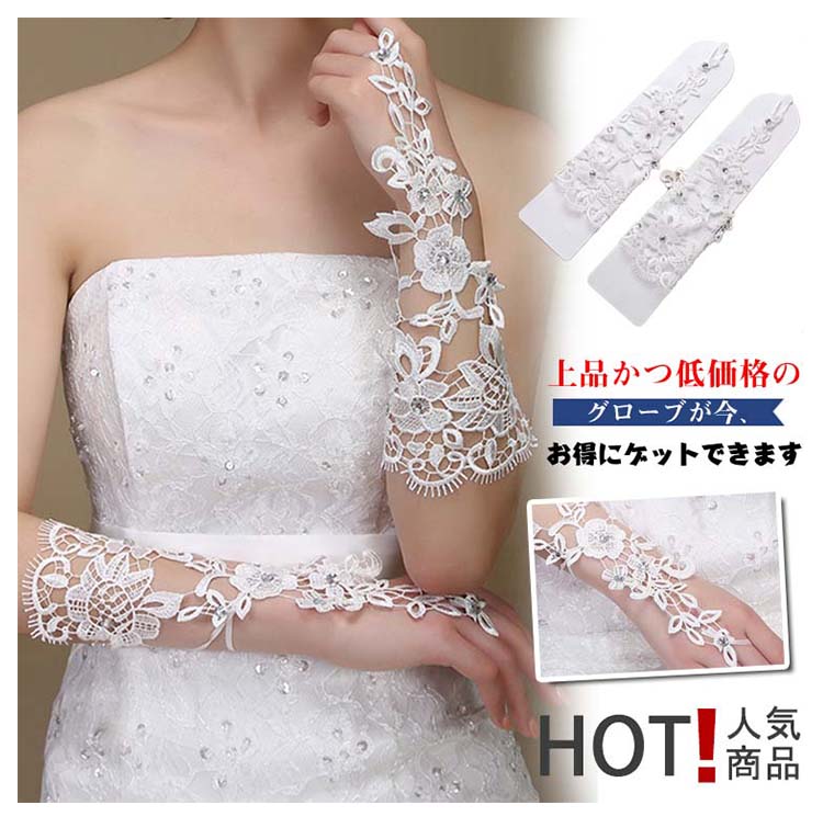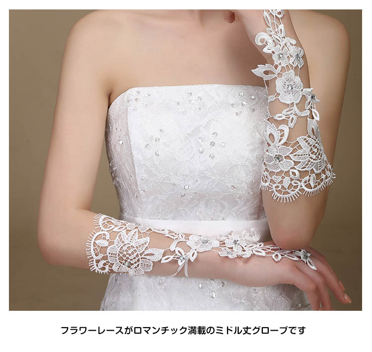 | フラワーモチーフをあしらったフィンガーレスウェディンググローブ登場パールが使われていて光を受けてキラキラ輝いて、繊細な手元を演出してくれますフラワーレースがロマンチック満載のミドル丈グローブです上品かつ低価格のグローブが今、お得にゲットできます | |