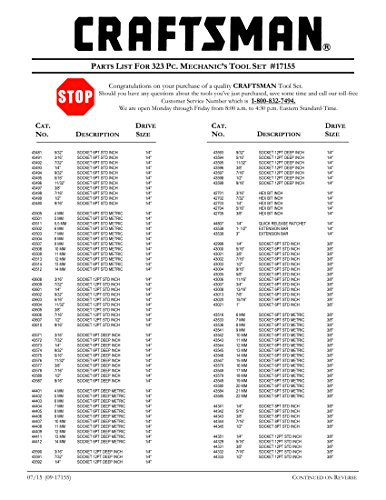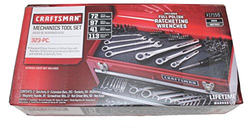 - The Craftsman 323 pc. Mechanics Tool Set includes: 182 Sockets (1/4", 3/8", 1/2" drive)