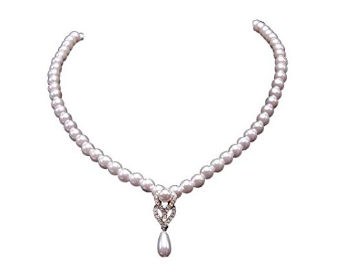 White Pearl Necklace with unique double V drop in austrian crystal and silver. Simple ivory pearl drop underneith. Necklace works best with a dress adorned with pearls or a plain dress. Chain: Pearl Length: 15.5" 1 1/4" drop Clasp: Lobster