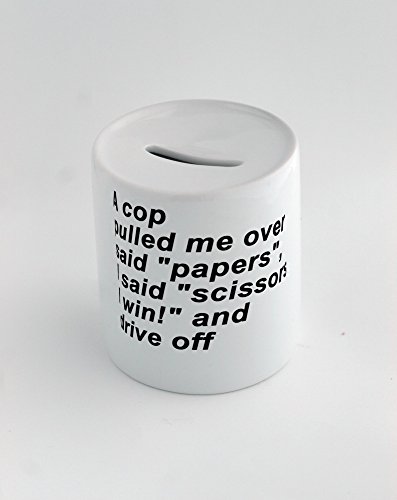 (PickYourImage)/Novelty Gag Toys/Money Banks/DIRECT FROM USA/Money box with A cop pulled me over said papers.. I said scissors I win and drive off