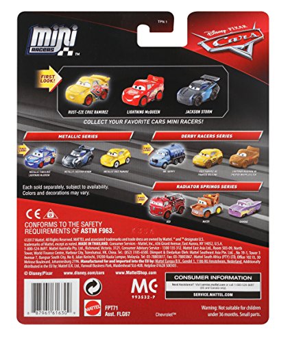-. Binding : Toy -. Brand : Disney -. EAN : 0887961616309 -. Feature : 3 packs of themed Disney/Pixar Cars 3 micro mini metal vehicles / Includes an exclusive car / Iconic details and wheels that roll for authentic action / The full assortment makes a unique collection and dynamic display / Collect them all! Each 3-pack sold separately, subject to availability -. IsAdultProduct : 0 -. Label : Mattel -. Manufacturer : Mattel -. Model : FPT71 -. MPN : FPT71 -. NumberOfItems : 1 -. PackageQuantity : 1 -. PartNumber : FPT71 -. ProductGroup : Toy -. ProductTypeName : TOYS_AND_GAMES -. Publisher : Mattel -. ReleaseDate : 2017-10-20 -. Studio : Mattel -. Title : Disney/Pixar Mini Racers Cars 3 Series Metal Vehicles, 3 Pack -. UPC : 887961616309 -. Warranty : 1 year warranty against manufacturer defects