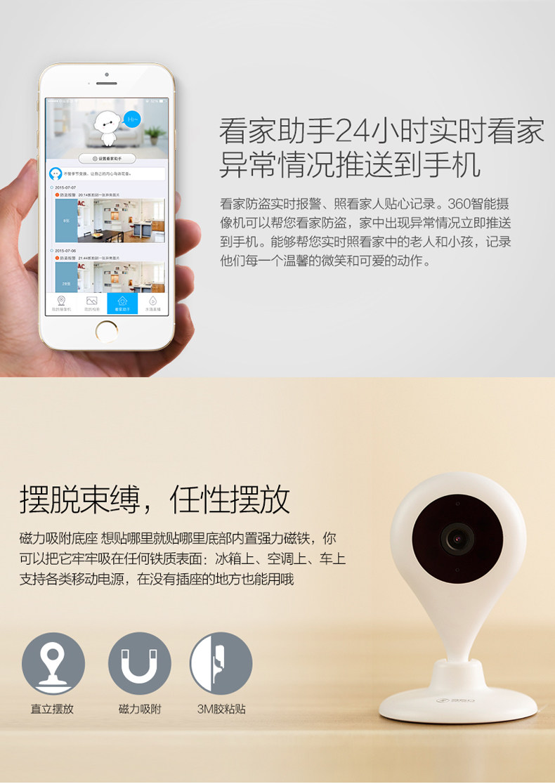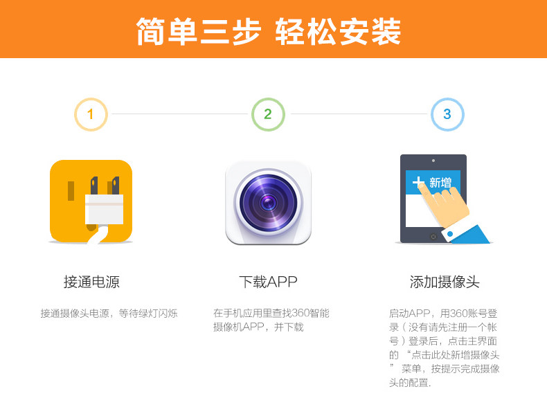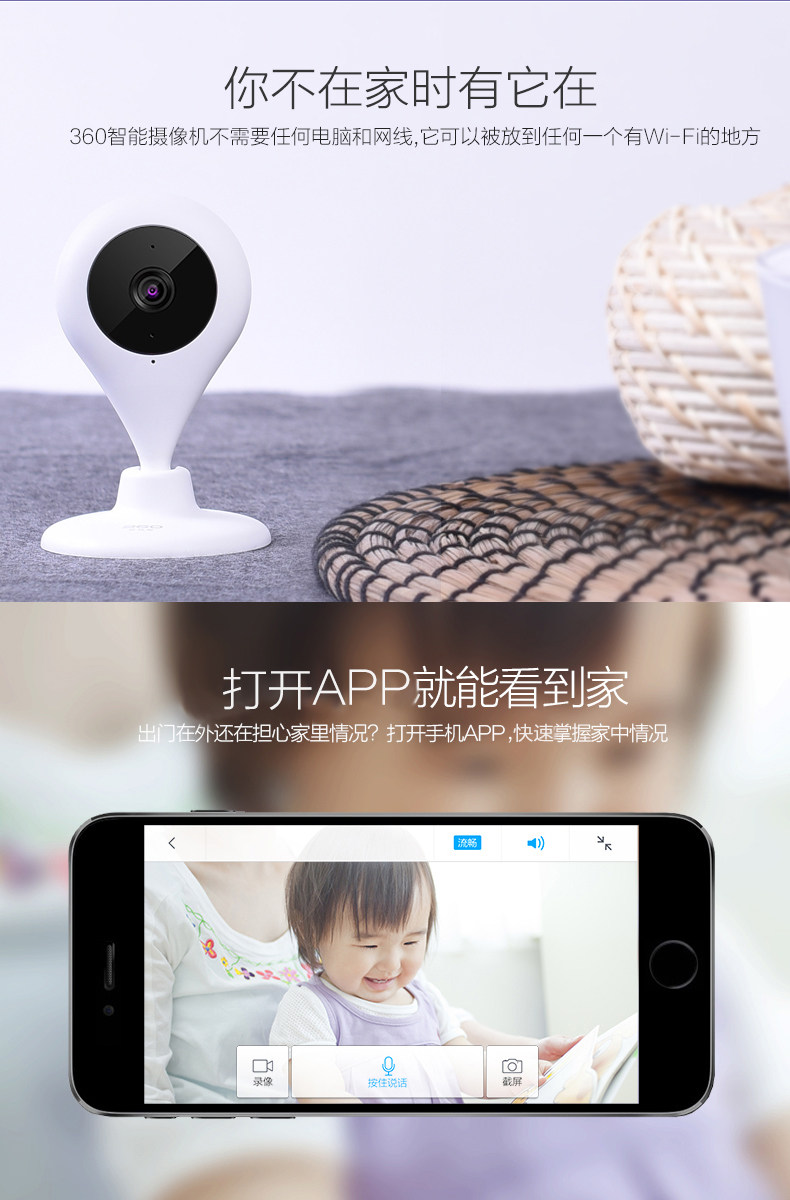 360 smart home guards using WiFi connection, now supports iPhone and Android phones perfectly, 360 smart home guards, installation is very simple, plug in the power, APP software installed on the phone, search for connections, next input wifi password, the connection is successful.