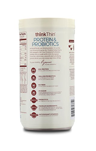 ReleaseDate : 2017-03-27 Studio : Prime Health Dietary Supplements, Inc. (thinkProducts) Publisher : Prime Health Dietary Supplements, Inc. (thinkProducts) Binding : Health and Beauty Product Description thinkThin Protein Probiotics Whey Powder, Belgian Chocolate helps support overall wellness. Each serving delivers 20 grams of protein, is high in fiber, and contains 1 billion CFUs probiotics (Bacillus Coagulans GBI-30 6086). Made with rich European cocoa, simply add chilled water for a delicious, smooth and satisfying protein drink you can enjoy any time of day. 0