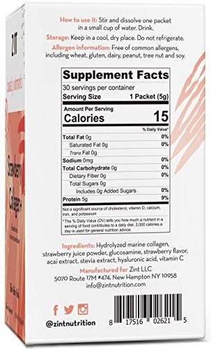 -. Feature : FORMULATED FOR BEAUTY: Strawberry Collagen+ by Zint is a sweet-flavored, Japan-sourced marine collagen powder boost with incredible added beauty-enhancing elements for skin, hair and nails, including glucosamine, acai extract, hyaluronic acid and vitamin C. / JUST DISSOLVE AND DRINK: Unlike other collagen products, our Collagen+ is designed to be dissolved in a small cup of water and nothing else, making it the easiest, most effective hydrolyzed collagen supplement you can find. / NATURAL SWEETNESS: The light, ephemeral strawberry sweetness of our sugar-free Collagen+ drink comes from natural stevia extract, making this a breezy, easy-to-drink flavor packet that you can carry in your purse and use anywhere. / DEEP BEAUTY THAT GLOWS: Restore skin moisture and smoothness, reduce wrinkles, strengthen hair and nails, and achieve a beautiful, naturally glowy complexion / A GUILT-FREE BEAUTY POTION: Gluten-free and sustainably sourced, our enhanced marine collagen drink rejuvenates skin, hair and nails