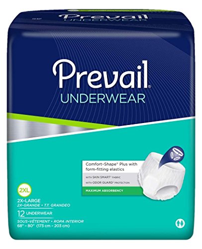 -. Feature : Designed for leakage protection with maximum absorbency, Prevail Underwear features Comfort-Shape Plus with gentle elastics that shape to your body for a more comfortable and discreet fit than standard adult diapers. / Prevail Underwear is the #1 rated brand in the healthcare industry. Each product is constructed with a discreet core technology that allows for thinner, highly-absorbent material that enables the user to move more freely and confidently. / Size 2X-Large fits waist sizes 68 to 80 inches for a snug and comfortable fit. Each Prevail incontinence product features a proprietary Quick Wick layer of material with MaxSoft Technology that provides advanced softness with rapid liquid absorption for optimal product performance. / This package includes one pack with 12 pairs of disposable underwear. / Prevail adult care products are manufactured in Pennsylvania with attention to quality, safety, sustainability, and responsible sourcing practices by First Quality, a family-owned company. Comments? Call 1-800-262-0042.
